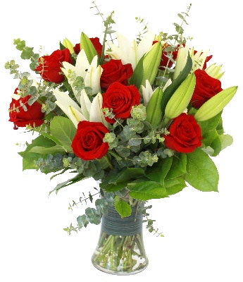 Stunning Beauty: Red Roses, White Lilies and Eucalyptus