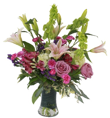 Valley Scents: Pink Lilies, Bells of Ireland, Lavender Alstroemerias, lavender Roses, White Hydrangeas, Pink Mini Carnations and Purple Statice