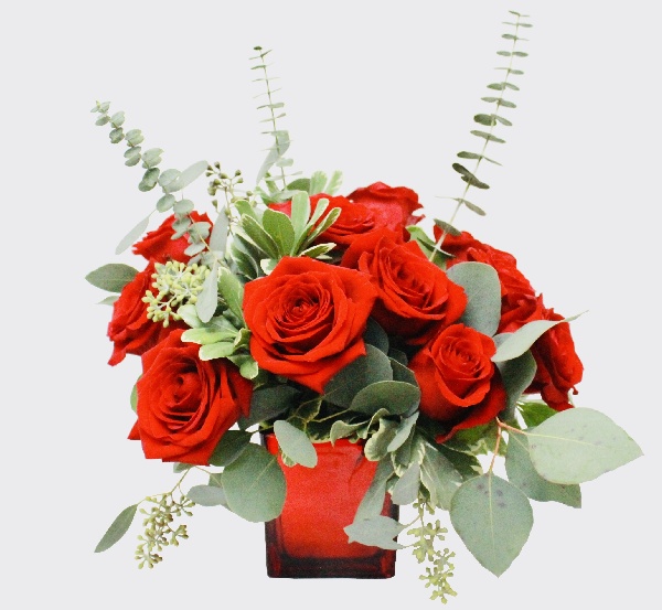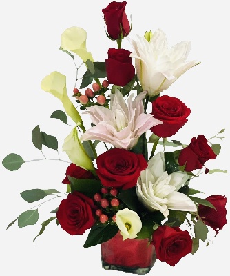 Red Roses and White Lilies arranged in a cube pot