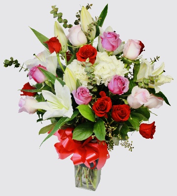 Red, Pink and Purple Roses; white Lilies and Greens