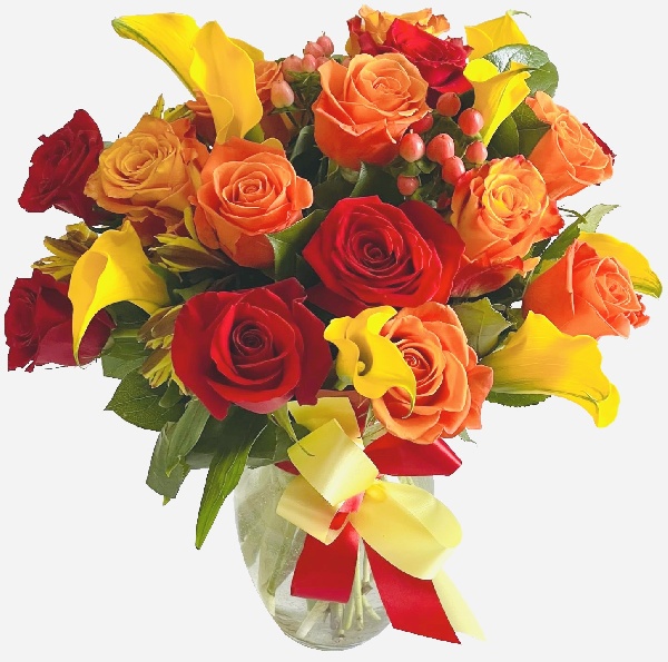 Red Roses, Yellow Roses, Yellow Mini Callas and Hypericum Berries