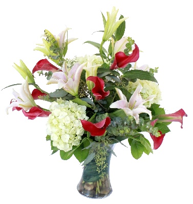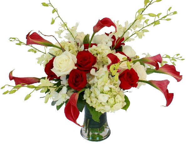 Magnificent Beauty: Red Roses, White Roses, White Dendrobium Orchids, Red Calla Lilies and White Hydrangeas