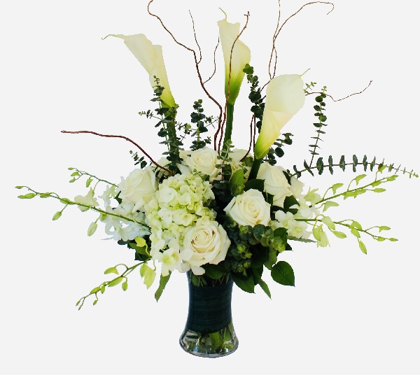 Angelic Presence: White Calla Lilies, White Roses, White Hydrangeas, White Dendrobium Orchids, Eucalyptus and Curly Willow