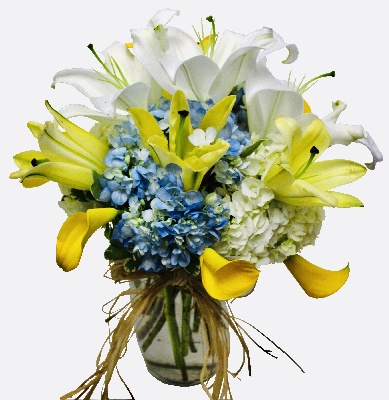 Tranquil Sunlight: Yellow Calla Lilies, White Lilies, Yellow Lilies, White and Blue Hydrangeas