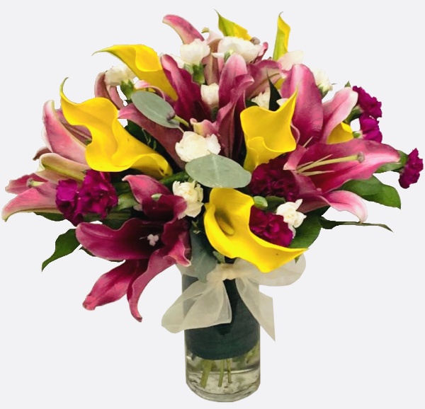 Beautiful yellow mini callas and pink lilies with a touch of white and lavender mini carnations