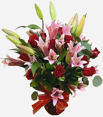 Gorgeous Bouquet of Red Roses ans Pink Lilies