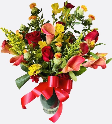Red Roses, Orange Callas, Yellow Alstroemerias and Yellow Solidago