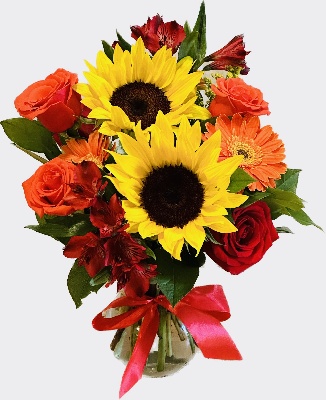 Sunflowers, Orange Roses, Red Roses, Orange Gerberas and Red Alstroemerias