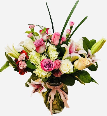 Lavender Roses, Pink Roses, Pink Mini Carnations, Pink Lilies, White Hydrangeas,