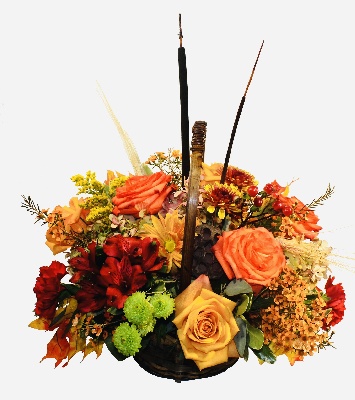 Autumn Breeze: Yellow Roses, Orange Roses, Red Alstroemerias, Orange Daisies, Brown Yellow Poms, Orange Waxflower and Solidago designed in a brown basket with accent of cattails.