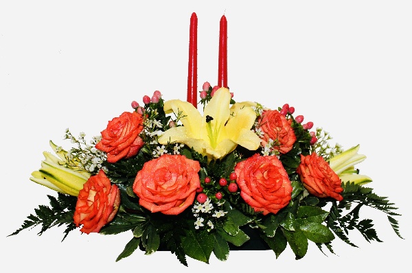 Lovely Sweetness: A centerpice of Bi-color Redish Orange Roses, Yellow Lilies, Pink Hypericums and White Wax Flowers with candles