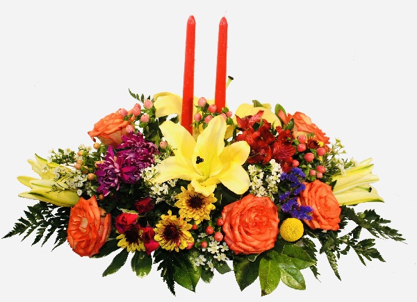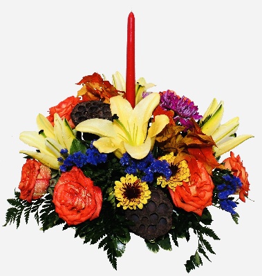 Fall Harvest Essence: A Centerpice of Bi-color Redish Orange Roses, Yellow Lilies, Brown Yellow Poms, Lavender Poms, Red Alstroemerias, White Wax Flowers, Purple Statice, Pink Hypericums and Red Spray Roses with candles