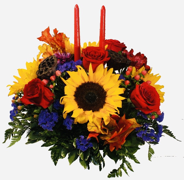 Lovely Autumn: A centerpiece of Sunflowers, Red Roses, Pink Hypericums, Red Alstroemerias, Purple Statice with accent of Lotus and two Candles