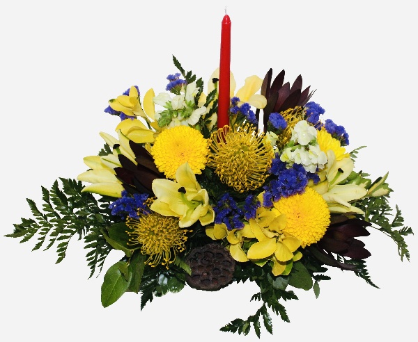 Fields of Autumn: A centerpiece of Yellow Cushion Poms, Yellow Lilies, Safari Sunsets, Yellow Snapdragons, Purple Statice with accent of Lotus Pods and a Candle