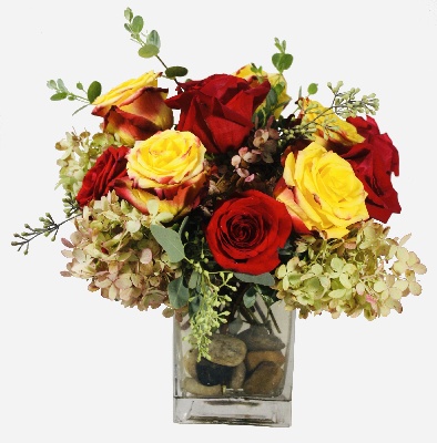 Precious Autumn: Bi-color Red Yellow Roses, Red Roses and Fall Hydrangeas arranged in a square glass vase